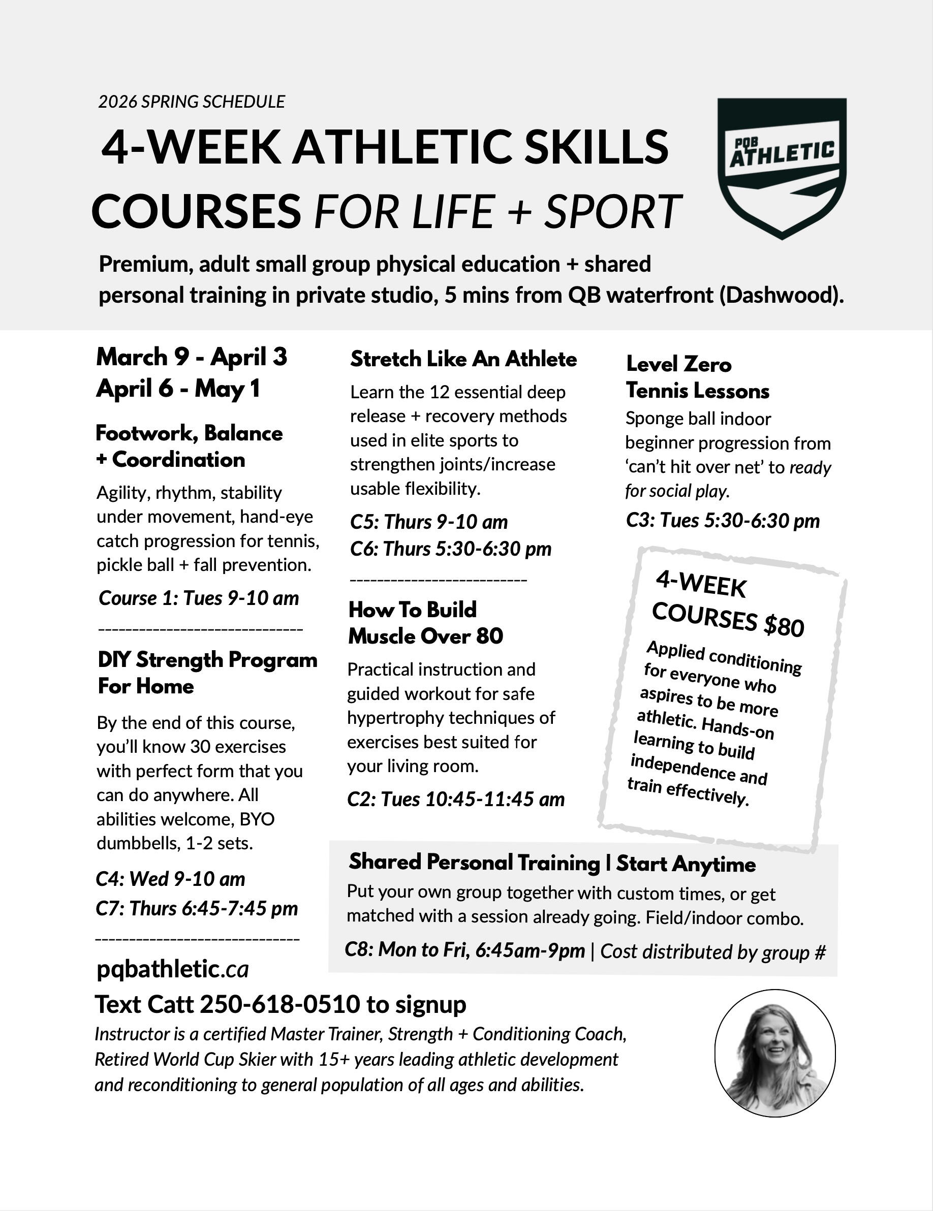 Welcome!PQB Athletic is an athletic skills and small group personal training company serving the Qualicum Beach community. We deliver structured four-week courses that teach athletic fundamentals for adults to improve performance in life and sport.Located at 'The Vault' - our stealthy, 1000 square foot private studio base just 5 minutes from the Qualicum Beach waterfront, our company is the place for baggy t-shirts and awkward learning curves, no mirrors or filming of you in class. Just like your high school gym class you loved and hated at the same time but fast forward to now, wished you'd paid more attention.This is instruction-based training where clients re-learn athletic foundations, correct long-standing habits, and build capacity with intention before increasing intensity. They recondition after injury or illness through assimilation of movement and corrected progression in biomechanics, coached through form not intensity.Matched shared personal training allows clients to join an existing group and split cost while continuing structured progression.Exercise therapy program development is also available for individuals who require targeted strength and mobility planning within a clear framework.Programming is delivered by Catt Smiley, an award-winning certified Master Trainer, Strength & Conditioning Coach, and retired World Cup skier with over 15 years leading athletic development to all abilities and ages.